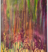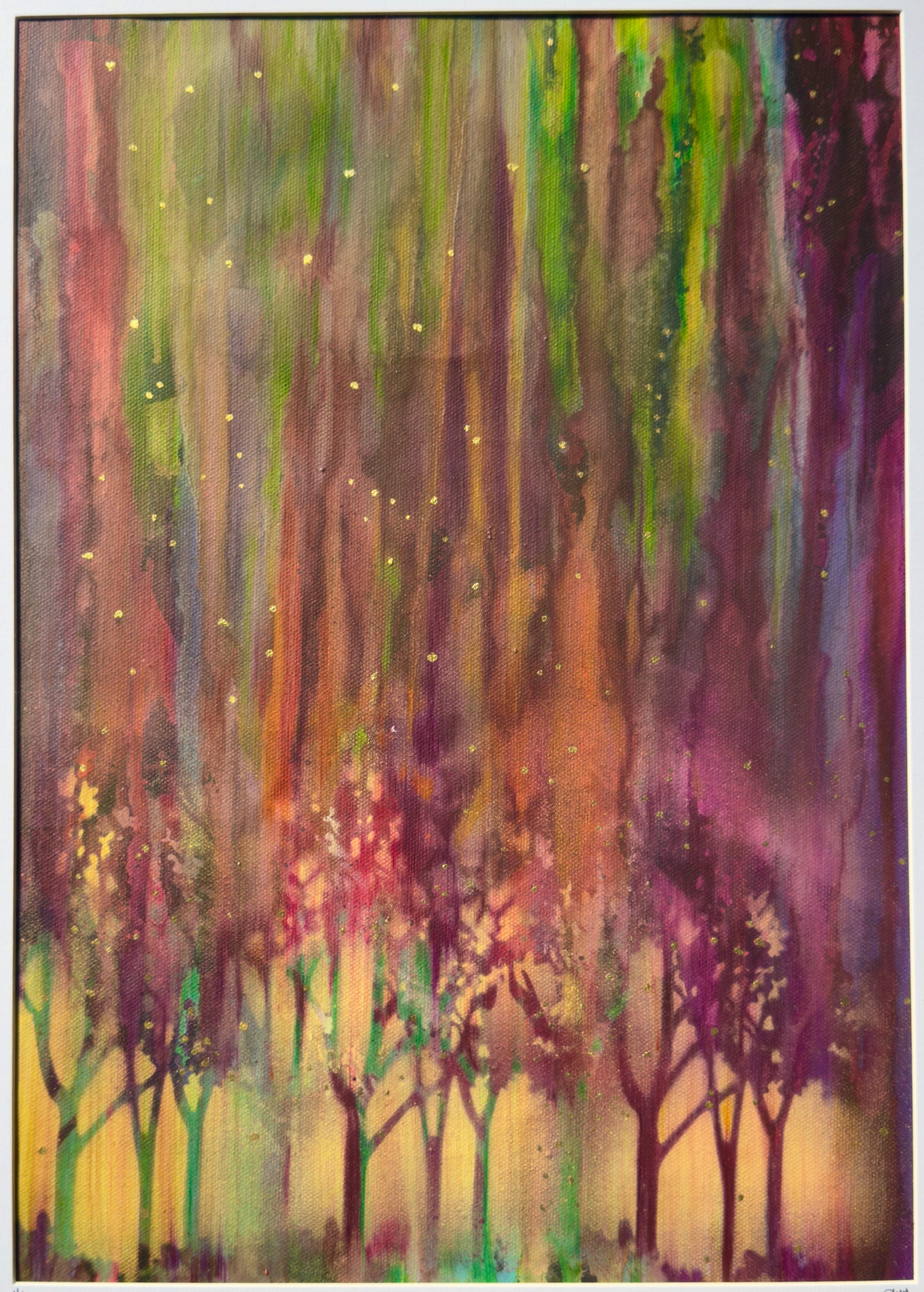 A captivating original abstract painting created using layered ink and acrylic. This dynamic composition blends vivid colour transitions with flowing textures, creating a sense of energy, depth, and movement. Rich tones of vibrant green, terracotta orange, deep violet, sapphire blue, and bold magenta sweep across the canvas in organic bands, contrasted with detailing  in gold, with the silhouettes of trees and people.
