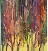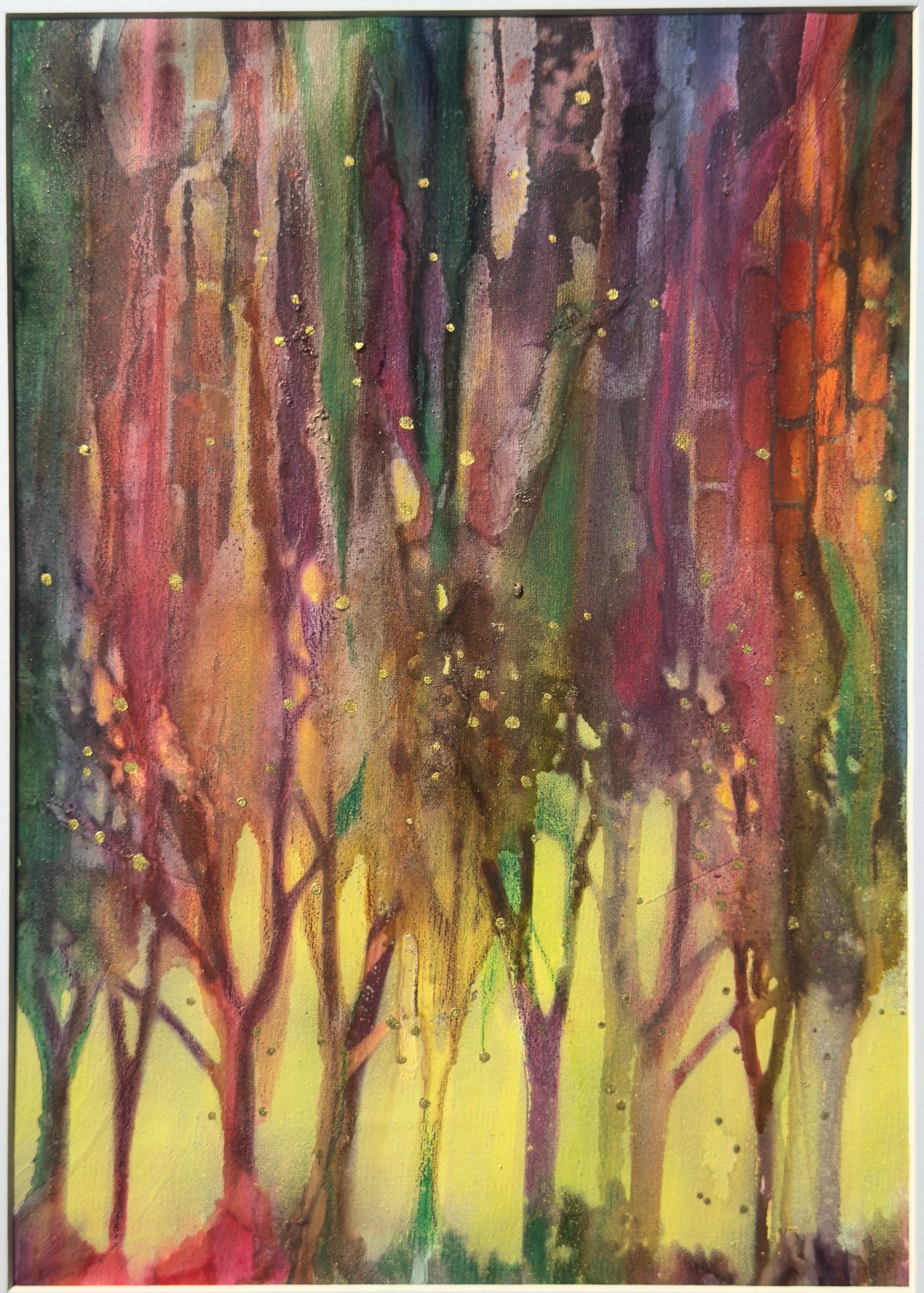 A captivating original abstract painting created using layered ink and acrylic. This dynamic composition blends vivid colour transitions with flowing textures, creating a sense of energy, depth, and movement. Rich tones of vibrant green, terracotta orange, deep violet, sapphire blue, and bold magenta sweep across the canvas in organic bands, contrasted with detailing in gold, with the silhouettes of trees and people.
