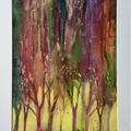 A captivating original abstract painting created using layered ink and acrylic. This dynamic composition blends vivid colour transitions with flowing textures, creating a sense of energy, depth, and movement. Rich tones of vibrant green, terracotta orange, deep violet, sapphire blue, and bold magenta sweep across the canvas in organic bands, contrasted with detailing  in gold, with the silhouettes of trees and people.