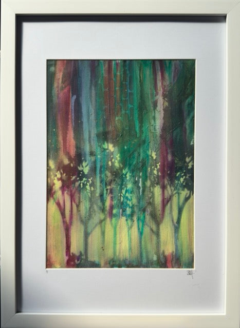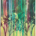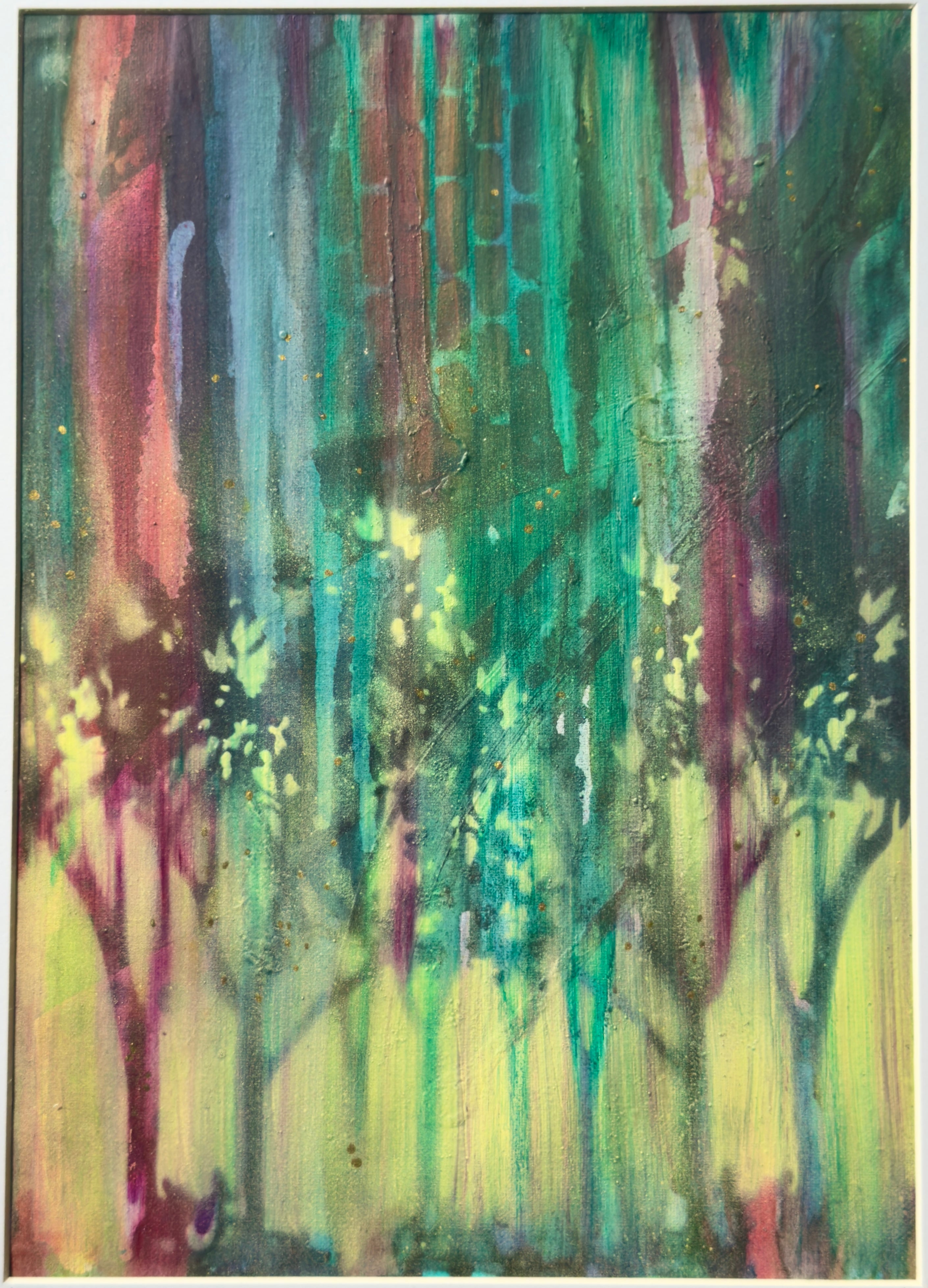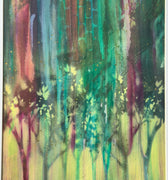 A captivating original abstract painting created using layered ink and acrylic. This dynamic composition blends vivid colour transitions with flowing textures, creating a sense of energy, depth, and movement. Rich tones of vibrant green, terracotta orange, deep violet, sapphire blue, and bold magenta sweep across the canvas in organic bands, contrasted with detailing in gold, with the silhouettes of trees and people.